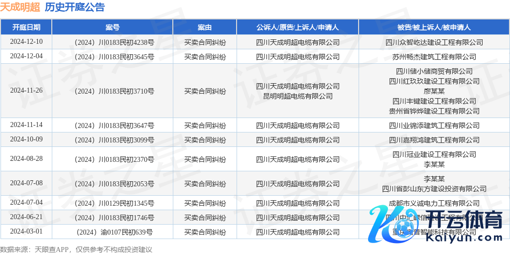 本站音书,把柄天眼查APP暴露,近日公布了一则四川天成明超电缆有限公司行为原告/上诉东谈主的开庭公告开yun体育网,详备本色如下: