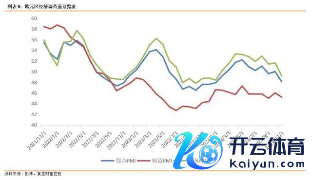 欧元区11月PMI经济出路拜谒表现经济增长出路黢黑,11月制造业PMI从46.0下滑至45.2,职业迹PMI从51.6降至49.2,概括PMI从10月的50降至48.1,这一下降标明经济行动出现减弱,尤其是制造业和职业迹的放缓。