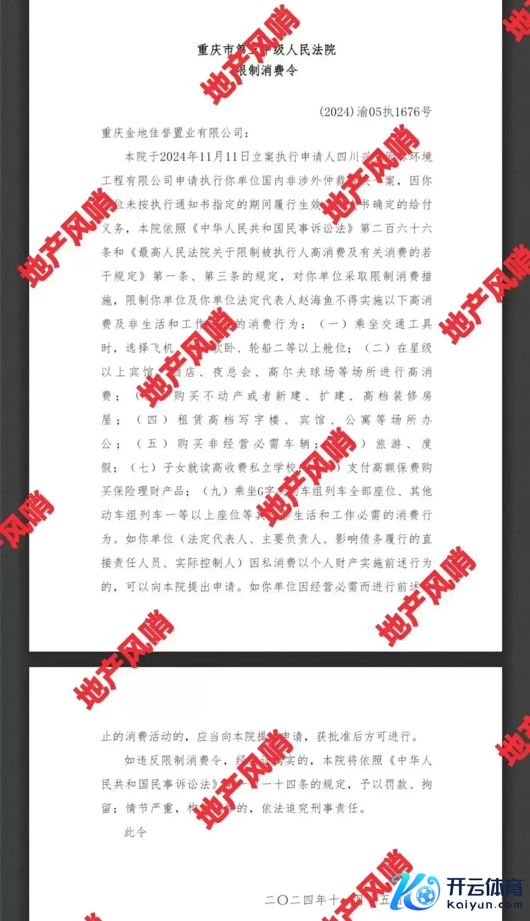除了金地集团的强制实行,金地下属的子公司,近期也有章程高忽地的情况。重庆市第五中院颁布的章程忽地令,限令金地集团下属的重庆金地佳誉置业有限公司(金地集团捏股93.22%),以及该公司的法东谈主代表赵海鱼不得有高忽地活动,如下图: