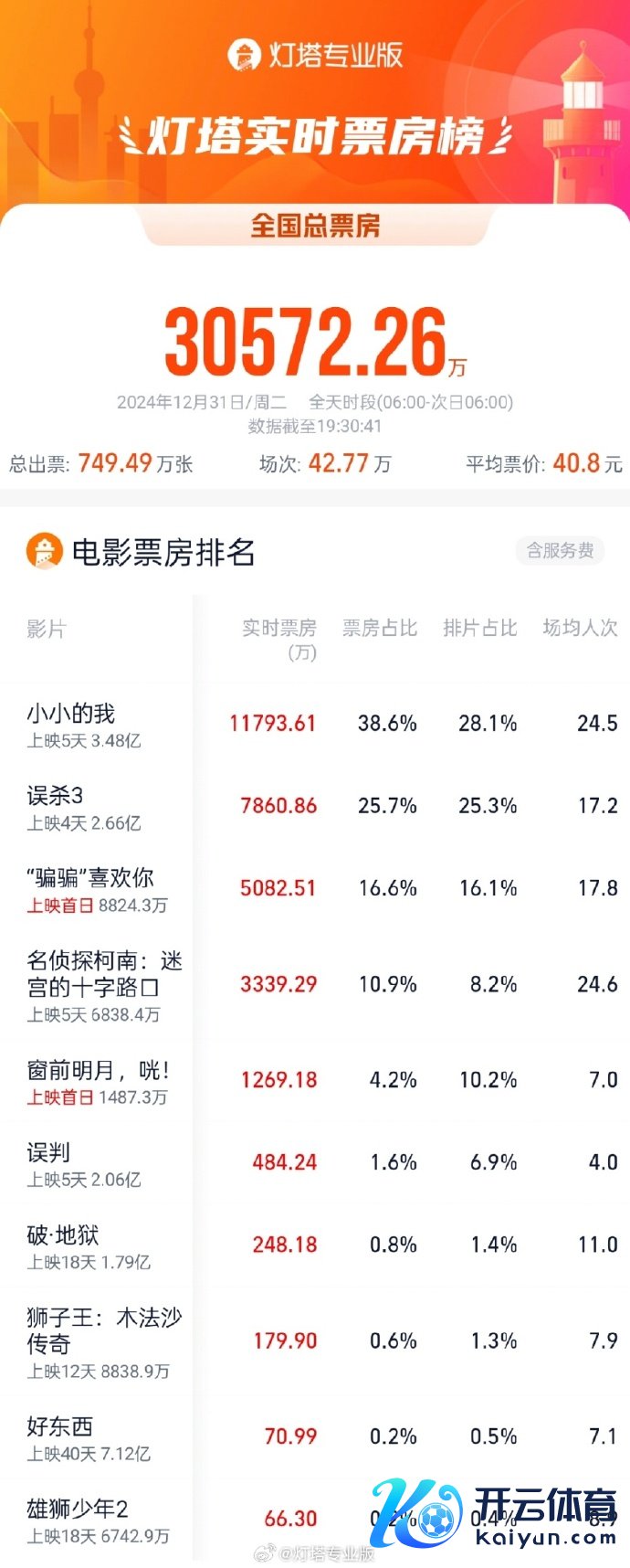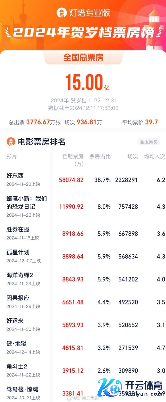 据灯塔专科版开yun体育网,适度12月31日20时32分,2024贺岁档(11月22日-12月31日)票房破30亿,影片《好东西》《小小的我》《误杀3》《误判》《破·地狱》位列档期票房前五名。
