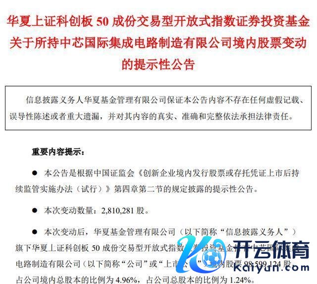 事情还得从中芯国外最近的公告提及。就在2月19号这天,中原上证科创板50ETF(简称科创50ETF)松弛减握了中芯国外281万股。减握之后,这个ETF握有的中芯国外股份比例从5.1%降到了4.96%,径直跌破了境内总股本的5%这个“举牌线”。于是,中芯国外赶快发布了一份公告,评释了此次握股比例变化的情况。