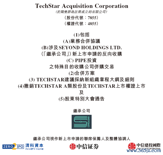 2025年8月26日,TechStar Acquisition Corporation(TechStar,SPAC公司,07855.HK)在港交所递交联系与Seyond Holdings Ltd (前称图达通控股有限公司,方针公司,以下简称“图达通”或“Seyond”)进行业务并吞、进行相当成见的收购公司并购交游(De-SPAC)的文献,视同IPO恳求,清科成本、中信证券、中信建投海外(举座融合东谈主)为其联席保荐东谈主。这是继其于2025年2月12日递表失效后的再一次恳求。